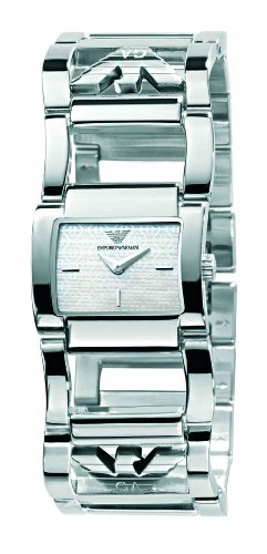 Stainless steel case with a stainless steel bracelet with Armani Eagle links. Fixed stainless steel bezel. White mother of pearl dial with silver-tone hands and stick markers at the 3, 6 and 9 o'clock positions. The Armani Eagle logo appears at the 12 o'clock position. Quartz movement. Scratch resistant mineral crystal. Skeletal case back. Case diameter: 25 mm. Case thickness: 7 mm. Jewelry clasp. Water resistant at 50 meters / 165 feet. Emporio Armani Fashion Women's Watch AR5737.